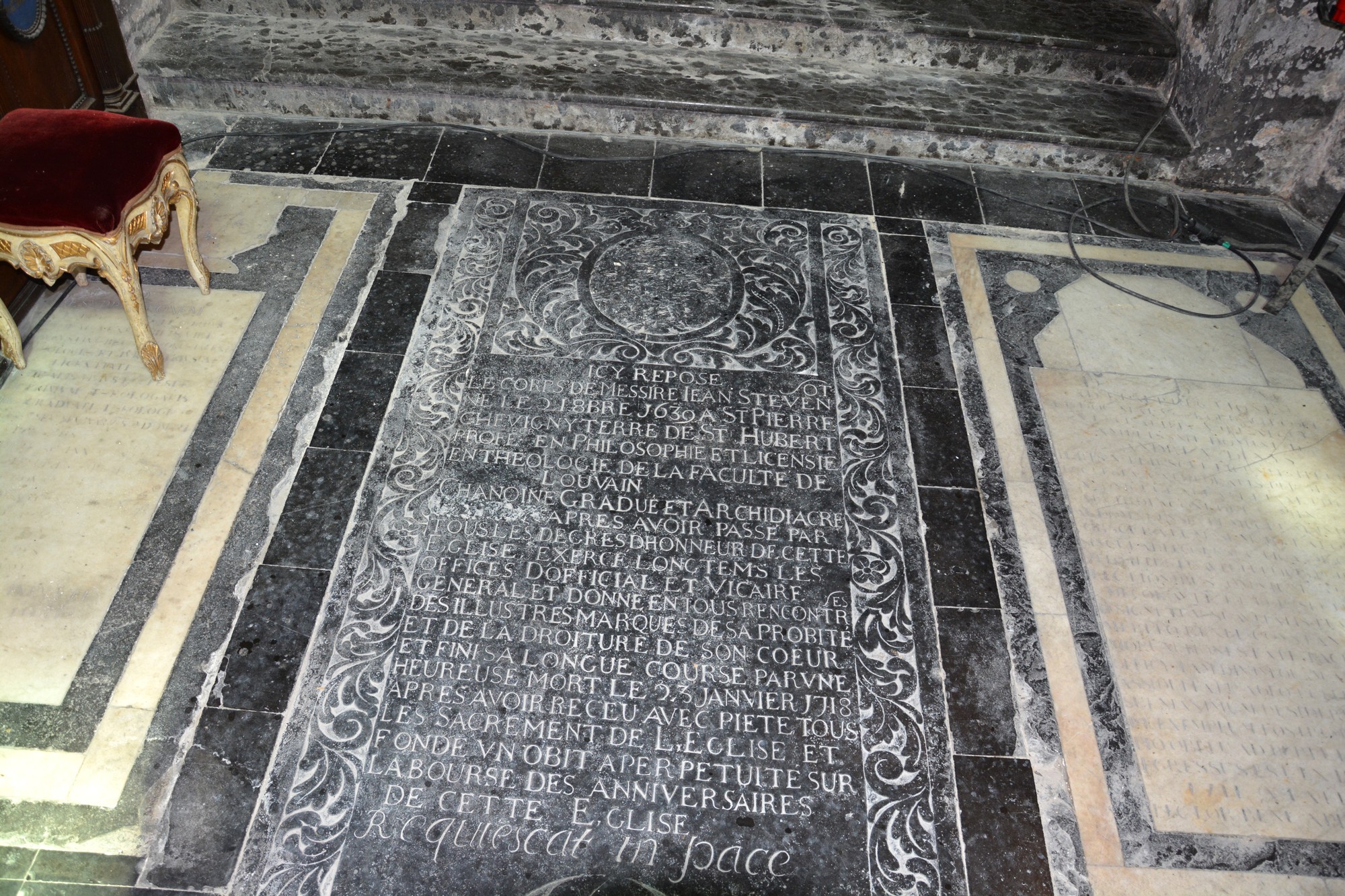 "Ci-gît un noble homme, Jean François Taffin, de cette église chanoine gradué, pendant plusieurs années « official » et chantre, après une mesure, archidiacre de Flandre, et, par le révérendissime évêque, [nommé ] vicaire général. Il vécut 61 ans. Il est mort bien méritant le 2 octobre 1701"