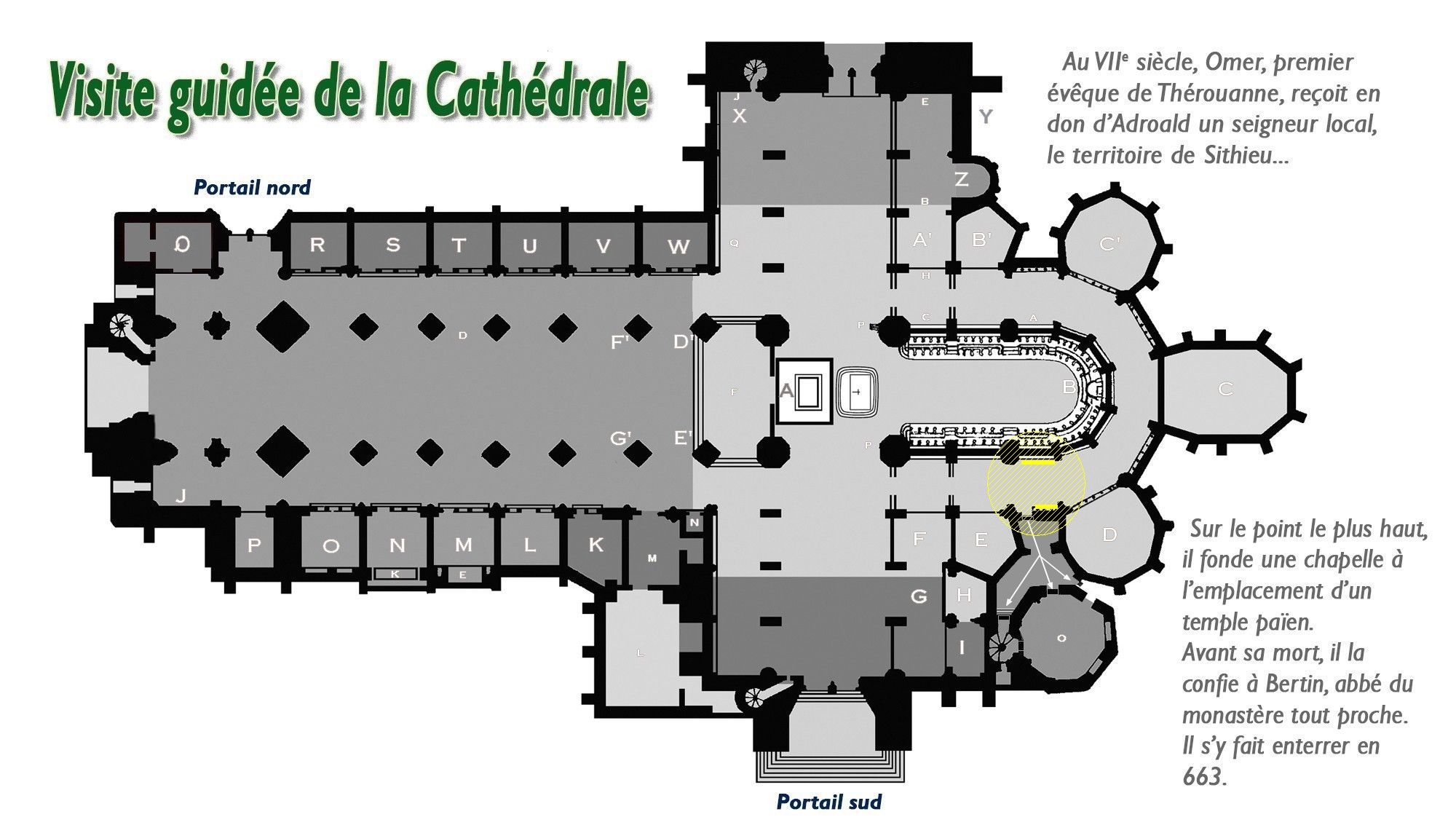 Vous trouverez ci-dessous la photographie des pierres tombales de Guillaume et Athala avec Odbertus Guillermus Walterus, tous inhumés initialement à Saint Bertin. Les paroissiens ont rappatrié leurs cendres dans la cathédrale en 1857. Sous l'arcade droite la pierre d'Athala. La plaque commémorative est en 4 parties. Chacune reprend, traduite en latin, une inscription d'un élément funéraire provenant des fouilles effectuées dans les ruines l'ancienne abbaye St Bertin.