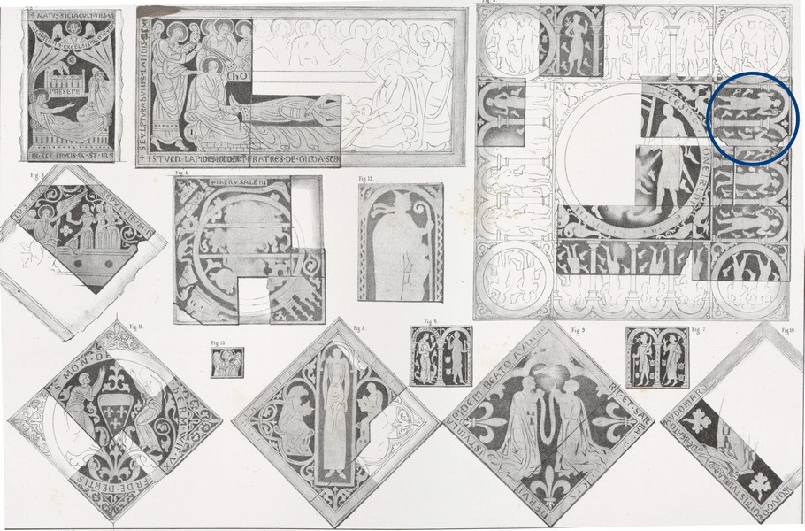 Dalle provenant de l'ancien dallage de l'église incendiée en 1201, on y voit des pélerins avec leurs bâtons usés par la marche et les chaussures qu'ils déposaient sur la tombe de saint Erkembode on y voit également une bourse destinée à encourager les dons à reconstruire une église plus grande. Dalle représentant un homme et une femme ( pélerins ). Ha : 0,73ml ; Lo : 0,69ml. Dans un cadre de bois et fixé au mur par des pitons.